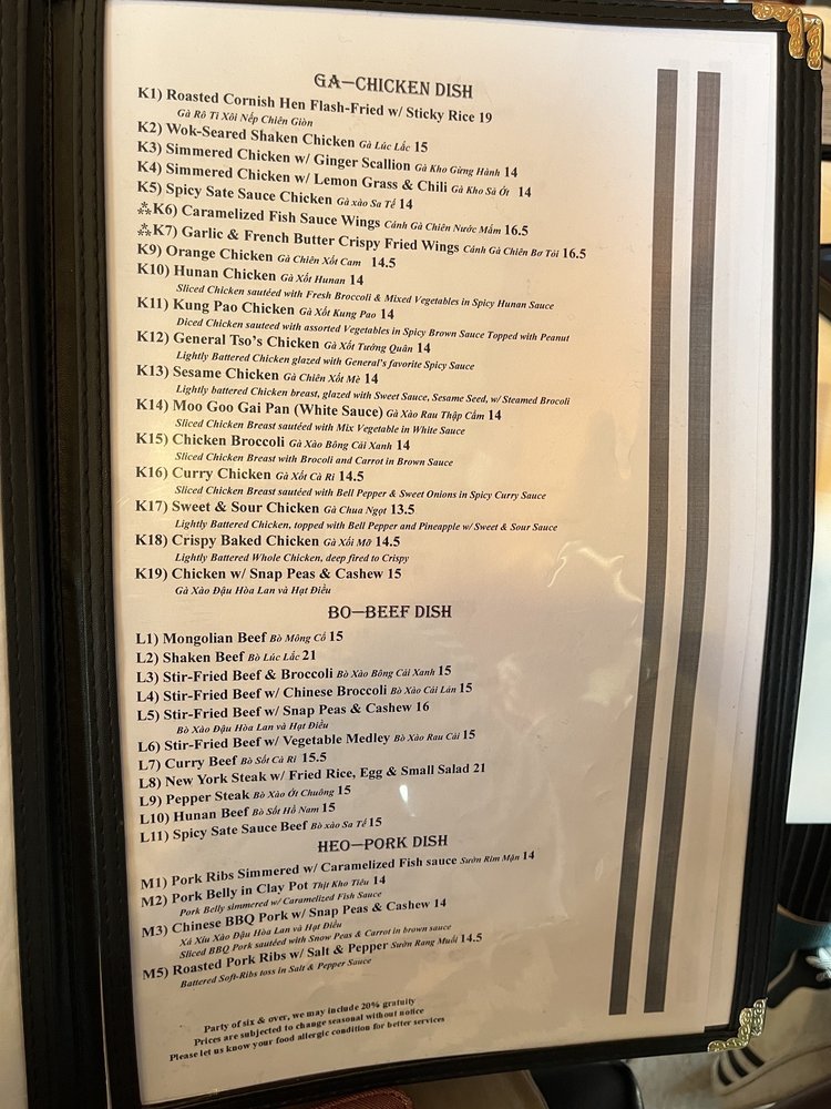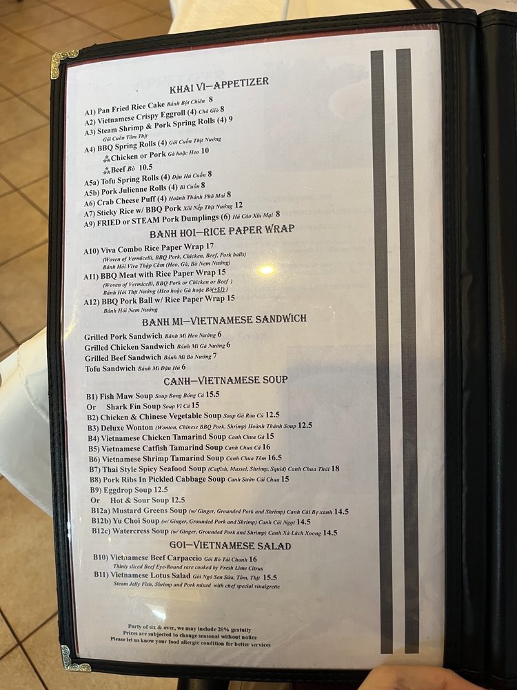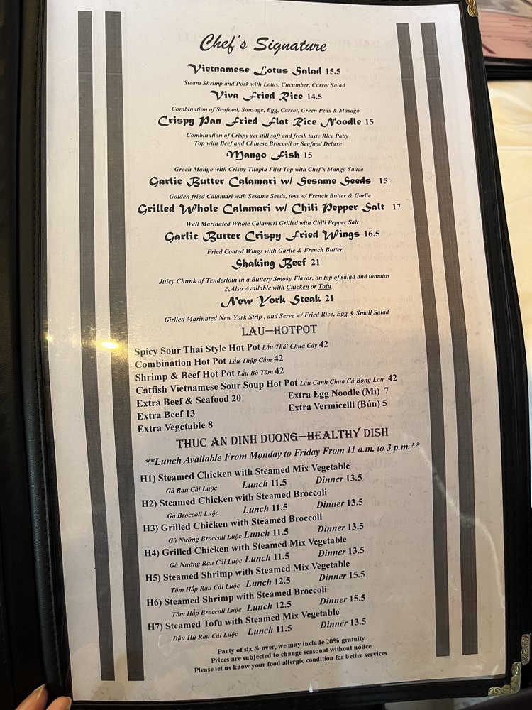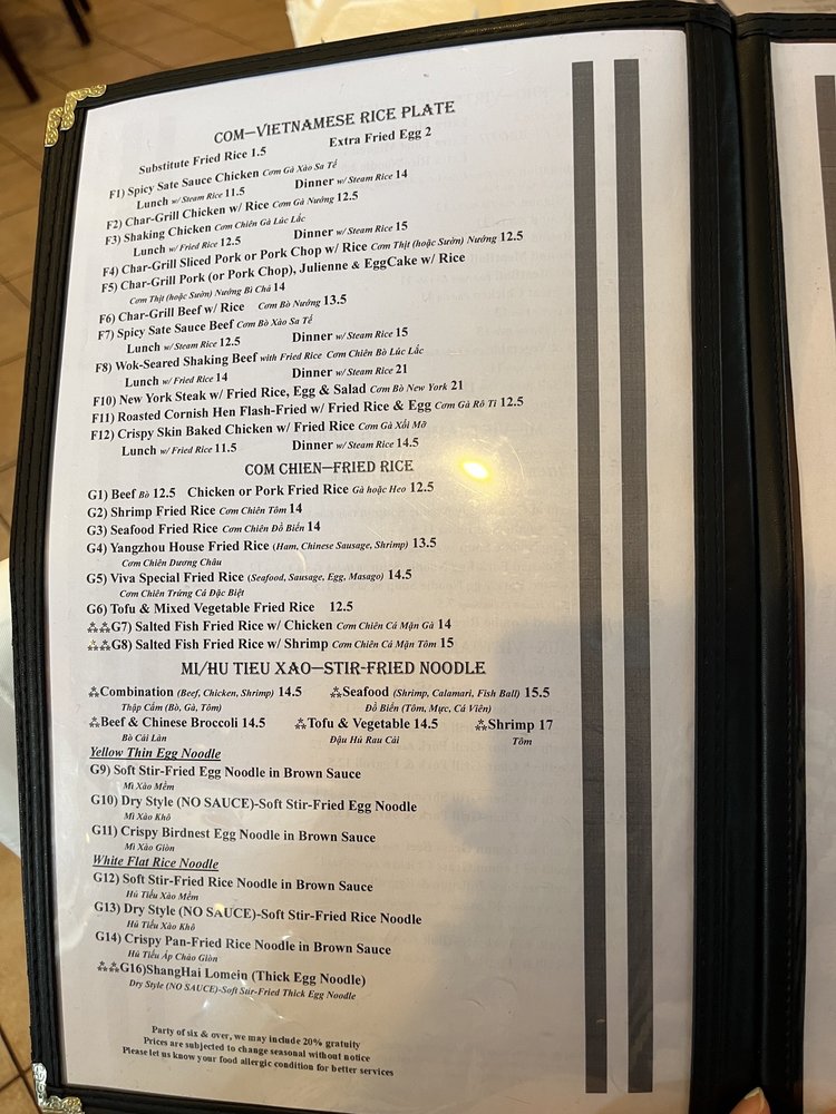 Introducing the menu at Viva Restaurant, located in Houston, TX, this Chinese-Vietnamese eatery offers a wide range of options for all tastes. With many vegetarian choices, the menu is full of flavorful dishes like crunchy fried flat rice noodles with beef and Chinese broccoli, vermicelli with pork, calamari, and chicken wings. Customers rave about the consistently delicious and fresh food, with ample portions perfect for sharing. The restaurant provides a casual and family-friendly vibe, with options for both takeout and dine-in. While some customers noted minor service issues, the overall experience at Viva Restaurant is highlighted by its authentic flavors and generous portions, making it a must-visit spot for those craving Vietnamese cuisine in the area.
